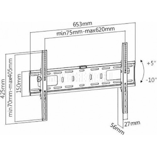 Для использования с телевизорами диагональю 37"-75", весом до 50кг. Расстояние телевизора от стены 56мм. VESA 200x200, 300x300, 400x200, 400x400, 600x400. Возможен подъем на 5 и наклон на 10 градусов.