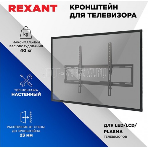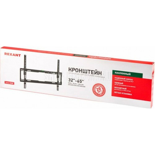 Кронштейн на стену для телевизора диагональю: 32"-65" дюймов наклонный REXANT серия HOME Тип: наклонный Назначение: для LED/LCD/PLASMA телевизоров и мониторов Цвет: черный Мин. диагональ: ТВ 32 дюйма Макс. диагональ: ТВ 65 дюймов Максимальный вес оборудования: 40 кг Тип монтажа: настенный Угол наклона: -0°/+8° Расстояние от стены до кронштейна: 23 мм Поддержка крепления стандарта VESA: 75х75/100х100/200x200/300x300/400x400/600х400 Крепление: в комплекте.