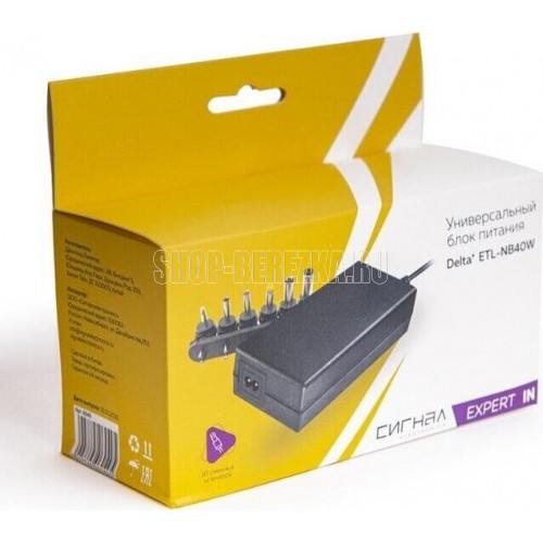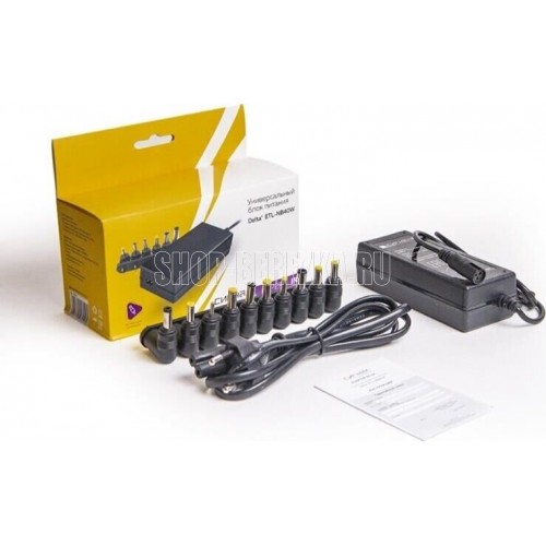 Блок питания «DELTA+» ETL-NB40W – это импульсный блок питания с стабилизированным напряжением. Предназначен для питания ноутбуков с напряжением 9-20V и максимальным выходным током 3160mA от источника переменного тока 110-240V. Имеет 10 сменных штекеров 10 сменных штекеров 4,8x1,7/ 4,8x1,7/ 6,5x4,4/ 4,0x1,7/ 5,5x1,7/ 5,5x3,0/ 5,5x2,5/ 2,5x0,7/ 4,8x1,7/ 5,5x2,1 и автоматический подбор выходного напряжения от 9 до 20V. Полярность положительная. Отличается высокой производительностью, также обеспечивает термозащиту, защиту от короткого замыкания и перегрузок. В комплектацию входит: блок питания «DELTA+» NB40W , инструкция полностью на русском языке, упаковка: блистер.