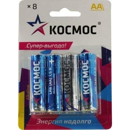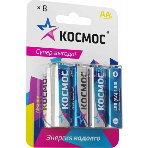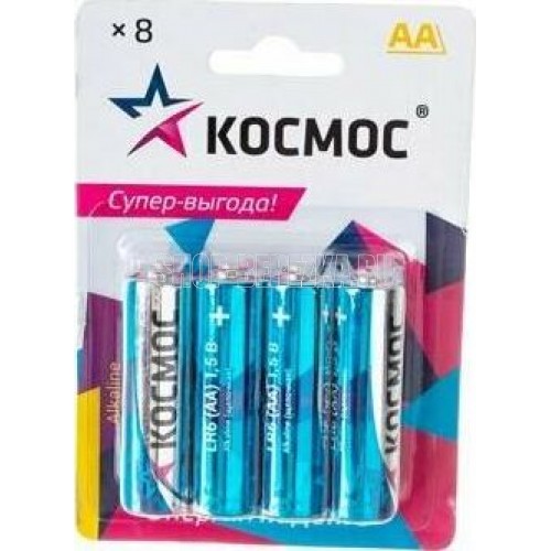 Щелочные (алкалиновые) батарейки Космос – в упаковке 8 шт - выгодная большая упаковка для розницы. Типоразмер батареек АА также называют «пальчиковые» (на приборах-потребителях может обозначаться как LR6, R6, UM3). Работают как дорогие батарейки – по резу