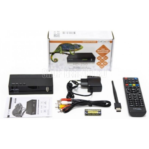Это высококачественный ТВ ресивер с обучаемым пультом управления в комплекте (можно с одного пульта управлять и ресивером, и телевизором). HD-250 подходит для приема ЭФИРного цифрового телевидения в формате DVB-T/T2/C. Его яркая упаковка не останется незамеченной на полке магазина. Сам ресивер выполнен из пластика и в лаконичном дизайне. Особенность этого ресивера в его комплектации. Вместе с устройством вы получаете USB Wi-Fi адаптер 7601. Это позволяет телевизору с помощью ресивера подключаться к беспроводной сети. Так с TV устройства можно выходить в интернет. На ресивере расположены следующие разъемы: антенный вход, 2 USB-разъема, HD OUT, композитный аудио-видео выход, разъем для подключения внешнего блока питания. HD-250 оснащен чипсетом GX6701. Поддерживает диапазон частот 174-862МГц. Ресивер имеет размер 120х64х28мм.