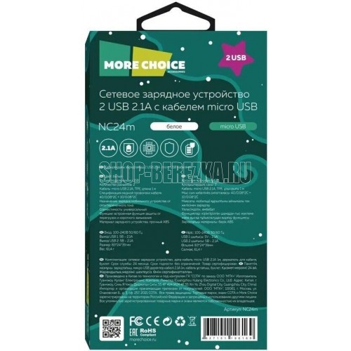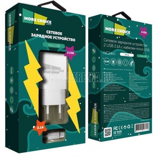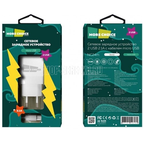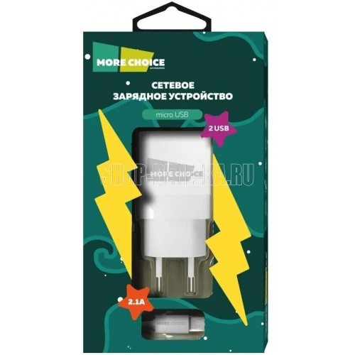 Сетевой адаптер с двумя USB-выходами и кабелем microUSB для зарядки смартфонов и прочих мобильных устройств. Сила тока - 2.1 А. Корпус сделан из термоэластопласта, коннектор - из поливинилхлорида. Представлен в белом и черном цветах. В комплекте - СЗУ, кабель microUSB, держатель для кабеля, буклет