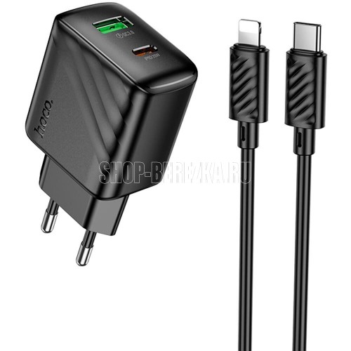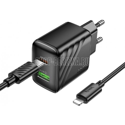 Универсальное сетевое зарядное устройство для электронной техники с двумя портами USB-A и Type-C подходит для быстрой зарядки одновременно двух устройств. В комплекте поставляется зарядный кабель Type-C - Lightning 8-pin длиной 1м