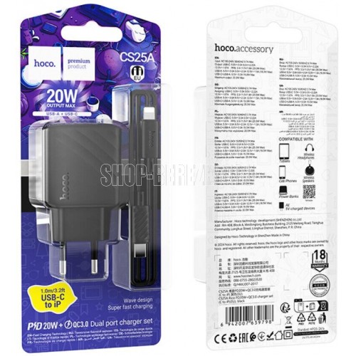 HOCO (6942007639798) CS25Aai 1USB+1Type-C 3.0A QC3.0 PD 20W , Black