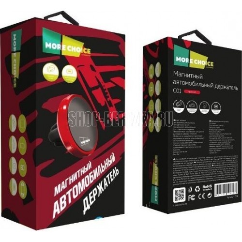 More choice C01 Держатель автомобильный магнитный Тип: держатель для смартфона Тип крепления: магнит Вид держателя: автомобильный Место крепления: воздуховод Предназначение: предназначен для удобства размещения цифровых устройств Особенности: мощный магнит притягивает портативное устройство и прочно фиксирует его положение в салоне авто Совместимость устройства: универсальный Материал: прочный пластик ABC, алюминиевый сплав, силикон, магнитная пластина Комплектация: автомобильный магнитный держатель, металлическая пластина для телефона, табличка для номера телефона, буклет Размер упаковки: 125*70*50 мм Вес: 26 г. Цвета: black, silver, red, gold
