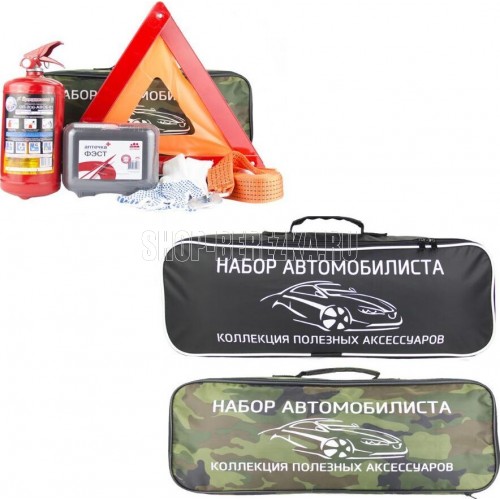 Набор автомобилиста необходим в каждом автомобиле. Содержит компоненты соответствующие Федеральному закону "О техническом осмотре транспортных средств". Предмет первой необходимости в случае ДТП. В комплекте: - огнетушитель порошковый ОП-2; - знак аварийной остановки в футляре; - аптечка; - трос буксировочный из полипропилена 4,8 м/5т; - перчатки х/б с напылением.