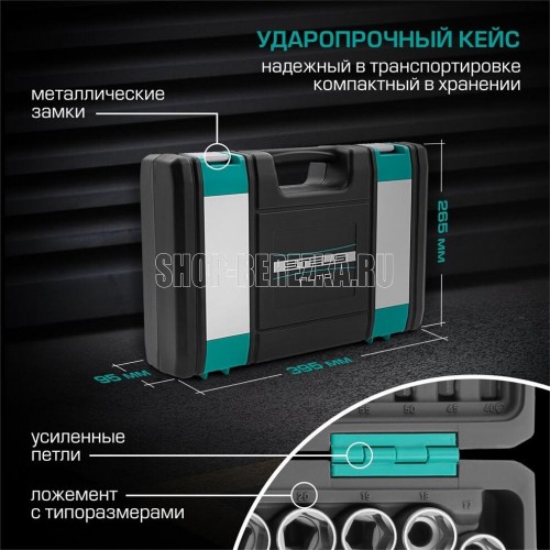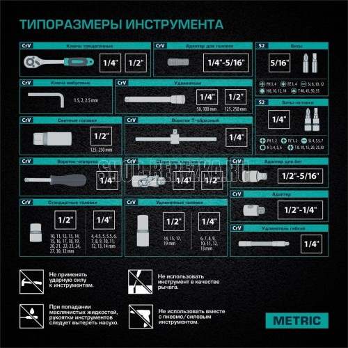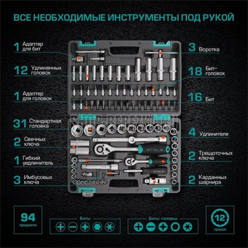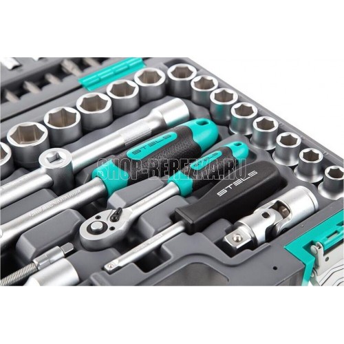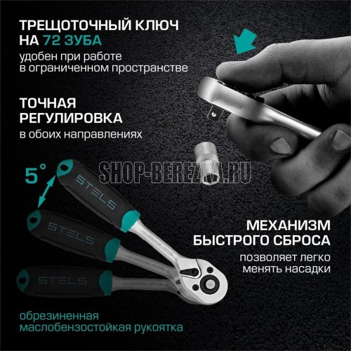 Наборы инструмента торговой марки STELS разработаны специально для автолюбителей и центров технического обслуживания. Каждый этап производства контролируется в соответствии с международными стандартами. Головки и комбинированные ключи изготовлены из хромованадиевой стали, придающей инструменту исключительную твердость в сочетании с легкостью. Биты, биты-вставки и отвертки производятся из стали S2, улучшающей свойства инструмента. Набор комплектуется трещотками с реверсом и быстрым сбросом, трещоточный механизм имеет 72 зуба и обеспечивает исключительную мягкость и плавность в работе. Шаг зуба 5 град. Все наборы упакованы в кейс, изготовленный из жесткого противоударного пластика, с металлическими застежками. Наборы инструмента STELS пригодятся вам не только в автомобиле. С их помощью можно проводить бытовой ремонт дома и на даче, ремонт бытовых конструкций и садовой техники. На все наборы инструментов STELS предоставляется пожизненная гарантия (подробнее об условиях гарантии вы можете узнать из гарантийного т