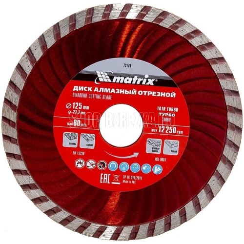 Отрезной алмазный диск Matrix Turbo 73179, 125 х 22,2 мм, сухая резка, является сменной оснасткой для углошлифовальных машин (УШМ). Он используется для ремонта и мелкого строительства, а также при решении бытовых задач. Диск предназначен для работ по бетону, в том числе свежему и среднеармированному, камню или кирпичу.ПреимуществаТурбированная рабочая часть обеспечивает интенсивное охлаждение и отвод пыли, повышая производительность диска.Диск сделан по технологии холодного прессования, а ширина рабочей части составляет 7 мм - этого достаточно для полноценного бытового применения.Высокая концентрация алмазных зерен в сочетании с оптимально подобранной связкой обеспечивает эффективную работу даже по железобетону.Водяное охлаждение не требуется, поэтому диск можно использовать с УШМ без подачи воды.