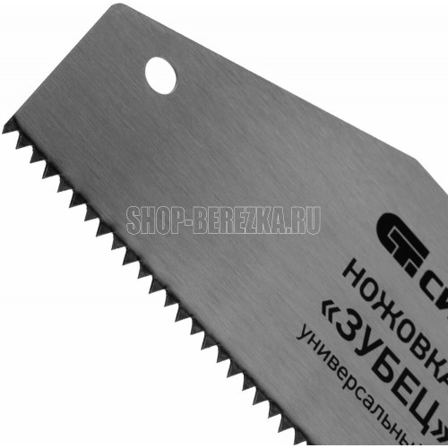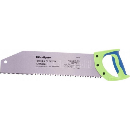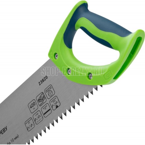 Ножовка по дереву Сибртех «Зубец» 23820 с полотном длиной 400 м, калеными зубьями с шагом 10 мм и 2D-заточкой, 2-компонентной рукояткой, используется для продольного и поперечного пиления древесины и ДСП. Рабочая кромка с шагом зубьев 10 мм обеспечивает быстрый рез. Зубья имеют 2D-заточку, благодаря чему ножовкой можно пилить в направлении как от себя, так и на себя. Возможна заточка режущей части. Ножовка применяется для выполнения плотницких работ, пригодится также и в быту.ПреимуществаПолотно изготовлено из легированной стали 65Mn, чем обусловлена его прочность и устойчивость к деформациям.Зубья ножовки закалены, что обеспечивает ей высокий ресурс работоспособности.Поверхность полотна покрыта лаком для защиты от коррозии.Рукоятка закреплена на полотне 3 винтами, поэтому не соскочит во время работы.Материал двухкомпонентной рукоятки — ударопрочный ABS-пластик, обеспечивающий надежность инструмента.Эргономичная рукоятка удобно лежит в руке, что повышает комфортность работы.