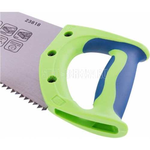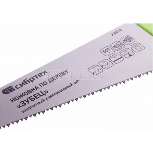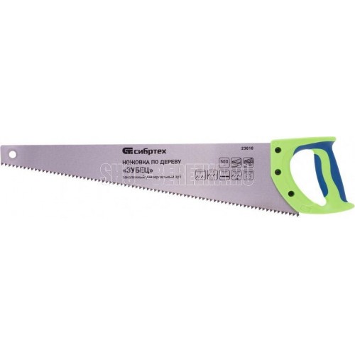 Ножовка по дереву Сибртех «Зубец» 23818 с полотном длиной 500 м, калеными зубьями с шагом 6,5 мм и 2D-заточкой, 2-компонентной рукояткой, используется для продольного и поперечного пиления древесины и ДСП. Рабочая кромка с 4 зубьями на дюйм обеспечивает быстрый рез. Зубья имеют 2D-заточку, благодаря чему ножовкой можно пилить в направлении как от себя, так и на себя. Возможна заточка режущей части. Ножовка применяется для выполнения плотницких работ, пригодится также и в быту.ПреимуществаПолотно изготовлено из легированной стали 65Mn, чем обусловлена его прочность и устойчивость к деформациям.Зубья ножовки закалены, что обеспечивает ей высокий ресурс работоспособности.Поверхность полотна покрыта лаком для защиты от коррозии.Рукоятка закреплена на полотне 3 винтами, поэтому не соскочит во время работы.Материал двухкомпонентной рукоятки — ударопрочный ABS-пластик, обеспечивающий надежность инструмента.Эргономичная рукоятка удобно лежит в руке, что повышает комфортность работы.