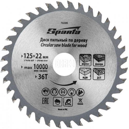 Пильный диск Sparta 732395 диаметром 125 х 22 мм, с 36 зубьями, используется для распила древесины мягких и твердых пород, фанеры, плит ДСП и МДФ. 36 зубьев обеспечивают оптимальное по скорости и качеству пиление. Благодаря попеременной заточке зубцов достигается высокое качество реза. Диск устанавливается на торцовочную, циркулярную пилу либо на распиловочный станок, применяется в бытовой сфере.