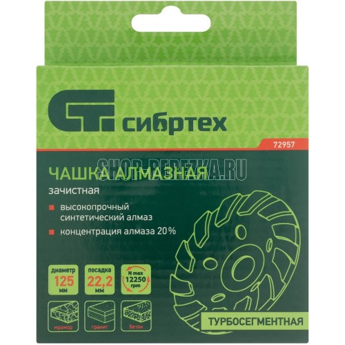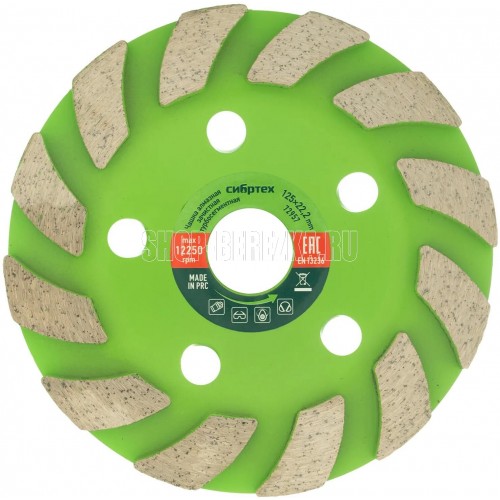 Турбо-сегментная зачистная алмазная чашка Сибртех 72957 диаметром 125 мм используется для поэтапной черновой обработки поверхностей и придания им гладкости. Оптимальна для шлифовки бетона, мрамора, камня, кирпича, гранита.