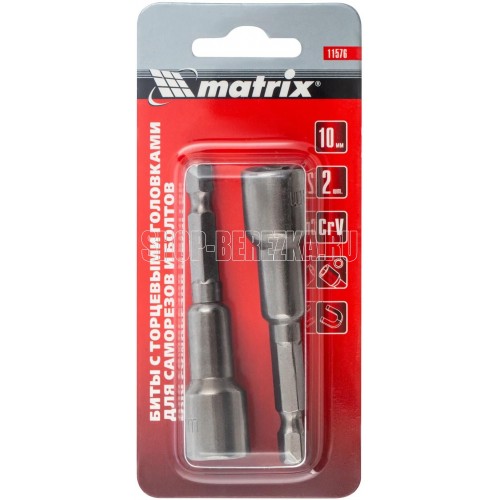 Биты с торцевыми головками Matrix 11576 размером 10 х 65 мм, 2 шт. в уп., предназначены для работ с шуруповертом.