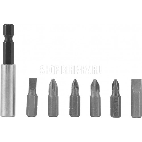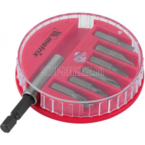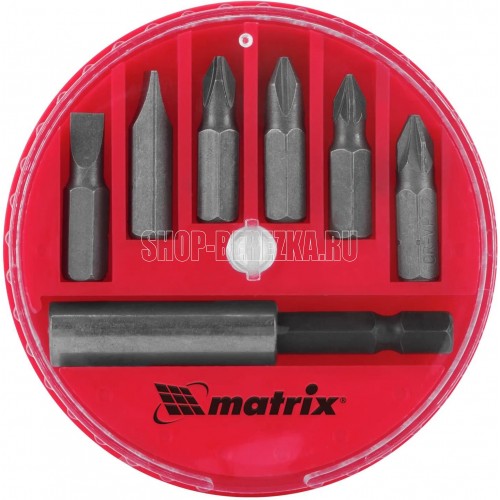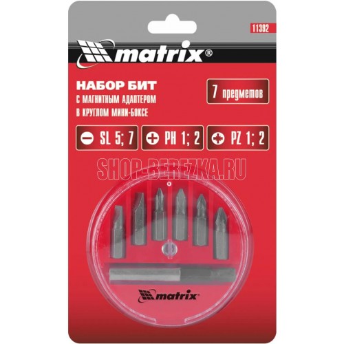 Набор Matrix 11392 поставляется в пластиковом закрытом боксе и состоит из 7 предметов: 6 бит из стали 45X со шлицами SL, PH, PZ и магнитного адаптера. Предназначен для шуруповертов, ручных и электрических отверток.