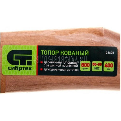 Кованый топор Сибртех 21608 длиной 400 м, с полотном весом 800 г, общим весом 1050 г, с прямым лезвием (тип Б2), поставляется в сборе с деревянным топорищем. Предназначен для рубки, тесания и грубой обработки древесины. Используется для заготовки дров и выполнения плотницких работ.ПреимуществаОптимальный показатель прочности — полотно изготовлено из стали 45 методом ковки.Высокий ресурс — рабочая кромка твердостью 50-55 HRC долго сохраняет остроту.Долговечность — топорище изготовлено из древесины твердых лиственных пород и пропитано защитным составом.