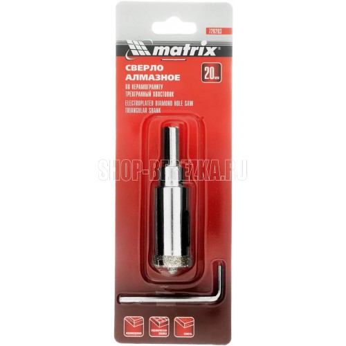 Универсальное алмазное сверло по керамограниту Matrix 726203 размером 20 х 67 мм, с 3-гранным хвостовиком, применяется для получения отверстий в стекле, плитке, кафеле.