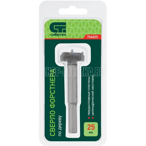 Сверло Форстнера по дереву Сибртех 704825 с цилиндрическим хвостовиком, используется для получения глухих отверстий диаметром 25 мм в древесине, ДСП, ДВП и других материалах.