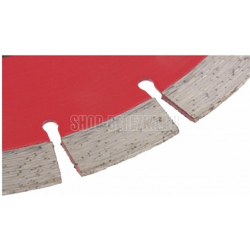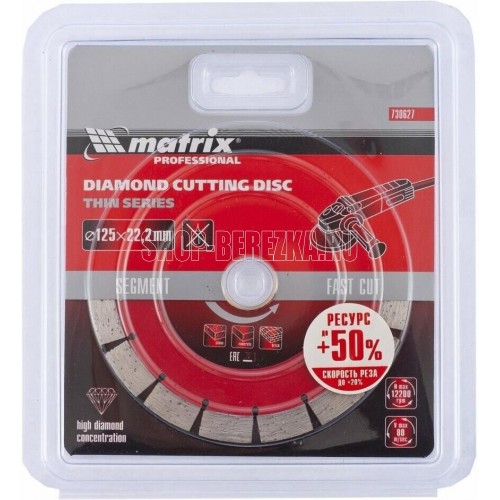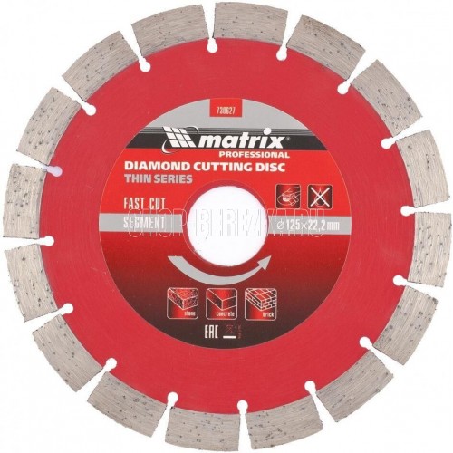 Отрезной сегментный алмазный диск Matrix ф125х22,2 мм 730627, тонкий, позволяет проводить сухое резание свежего и старого бетона, камня, гранита, шлакоблока, тротуарной плитки, песчаника и кирпича с помощью УШМ. Его можно использовать как в частной мастерской, так и на стройке для решения профессиональных задач. Тонкий корпус диска способствует снижению нагрузки на инструмент, позволяя ускорить рабочий процесс на 20%.Преимущества16 сегментов позволяют быстро проводить работы по различным материалам без водяного охлаждения диска.За счет ширины режущего слоя 10 мм и высокой концентрации алмазов диск быстро разрезает материалы без риска преждевременного износа.Плотная металлическая связка отлично удерживает алмазы, обеспечивая их равномерное истирание, своевременную раскрываемость и полную выработку.Технология ускоренного горячего прессования делает диск устойчивым к высоким нагрузкам и износу.