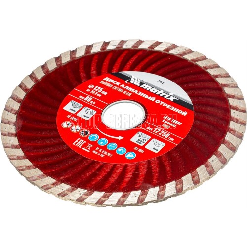 Отрезной алмазный диск Matrix Turbo 73179, 125 х 22,2 мм, сухая резка, является сменной оснасткой для углошлифовальных машин (УШМ). Он используется для ремонта и мелкого строительства, а также при решении бытовых задач. Диск предназначен для работ по бетону, в том числе свежему и среднеармированному, камню или кирпичу.ПреимуществаТурбированная рабочая часть обеспечивает интенсивное охлаждение и отвод пыли, повышая производительность диска.Диск сделан по технологии холодного прессования, а ширина рабочей части составляет 7 мм - этого достаточно для полноценного бытового применения.Высокая концентрация алмазных зерен в сочетании с оптимально подобранной связкой обеспечивает эффективную работу даже по железобетону.Водяное охлаждение не требуется, поэтому диск можно использовать с УШМ без подачи воды.