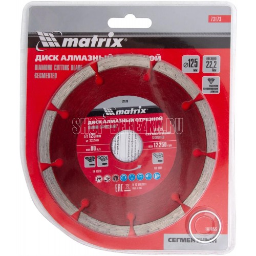 Алмазный отрезной сегментный диск Matrix 73173 диаметром 125 х 22,2 мм предназначен для сухой резки натурального и искусственного камня, кирпича, свежего и твердого бетона. Применяется с углошлифовальными машинами соответствующего типоразмера.