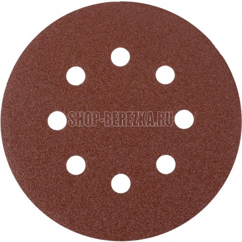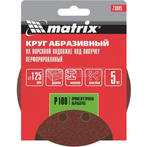 Перфорированный абразивный круг Matrix 73805 диаметром 125 мм, со среднезернистым абразивом P 100, на ворсовой подложке под «липучку», 5 шт. в упаковке, используется для промежуточного шлифования металла, древесины, пластика и других поверхностей.