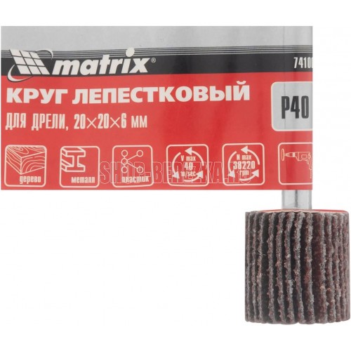 Лепестковый круг Matrix 74100 размером 20 х 20 х 6 мм, с зернистостью P 40, — оснастка для дрелей и прямых шлифовальных машинок с посадочным гнездом 6 мм, рассчитанная на скорость вращения до 23900 об/мин. Круг применяется для грубой обработки древесины, металла и других материалов.