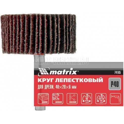 Лепестковый круг Matrix 74165 размером 40 х 20 х 6 мм, с зернистостью P 40, — оснастка для дрелей и прямых шлифовальных машинок с посадочным гнездом 6 мм, рассчитанная на скорость до 12000 об/мин. Круг применяется для грубой обработки древесины, металла и других материалов. Крупнозернистый абразив P 40 эффективно снимает толстые слои краски и ржавчины, зачищает сварные швы, удаляет заусенцы