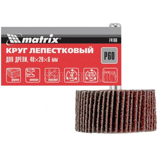 Лепестковый круг для дрели Matrix 74166 размером 40 х 20 х 6 мм, с зернистостью P 60, используется для черновой обработки металлических и деревянных поверхностей. Имеет стальной хвостовик диаметром 6 мм, при помощи которого устанавливается в патрон дрели или прямой шлифовальной машины с максимальной скоростью вращения 12000 об/мин. Крупнозернистый абразив P 60 легко удаляет слои ржавчины, краски и лака, обрабатывает сварные швы, удаляет заусенцы.