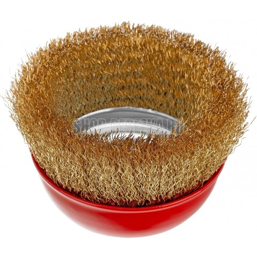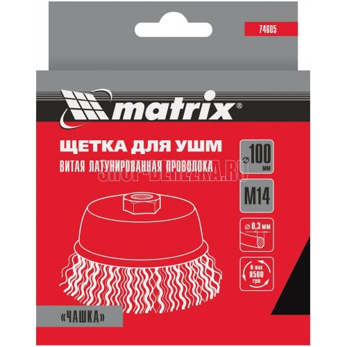 Щетка «чашка» Matrix 74605 диаметром 100 мм, с щетиной из латунированной витой проволоки, устанавливается на вал УШМ с помощью гайки М14. Предназначена для снятия тонкого слоя краски или лака, удаления ржавчины и загрязнений. При рекомендованной скорости вращения 8500 об/мин щеткой можно быстро обрабатывать участки большой площади.