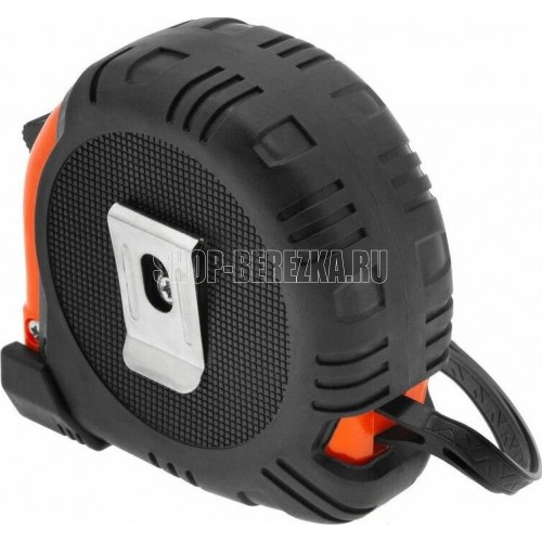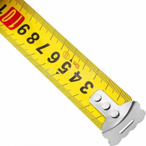 Пластиковый корпус обрезинен для защиты инструмента при падениях. Плавающий зацеп измерительного полотна обеспечивает точные измерения поверхностей. Специальное окошко в зацепе измерительного полотна позволяет использовать рулетку в качестве циркуля. Возвратная пружина усиленного типа.