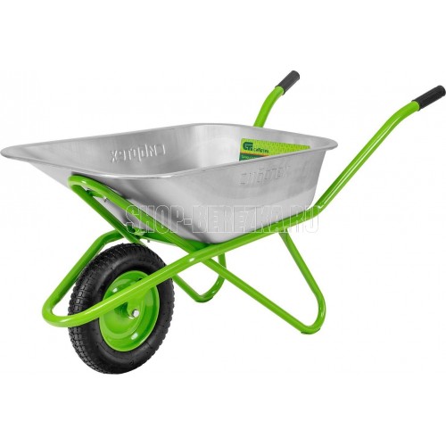 Садово-строительная тачка Сибртех 689638 грузоподъемностью 170 кг, с кузовом объемом 110 л, предназначена для транспортировки грузов. Подходит для перемещения сыпучих материалов (песка, цемента, гравия и т.д.), вывоза строительного и садового мусора, а также для перевозки грунта, дерна, мульчи и других грузов. Одноколесная тачка отличается повышенной маневренностью. Пневматическое колесо обеспечивает плавность хода. Тачка незаменима на строительной площадке, дачном участке, складе. Преимущества Надежная конструкция — рама диаметром 32 мм и опора диаметром 25 мм изготовлены из стальной трубы с толщиной стенки 1 мм, поэтому тачка выдерживает нагрузку до 170 кг. Устойчивость к деформации — толщина стенок кузова составляет 0,7 мм, его края завальцованы для повышения ударопрочности. Защита от разрушения — цинковое покрытие предохраняет кузов от образования коррозии. Удобная эксплуатация — передний упор позволяет производить фронтальную разгрузку.
