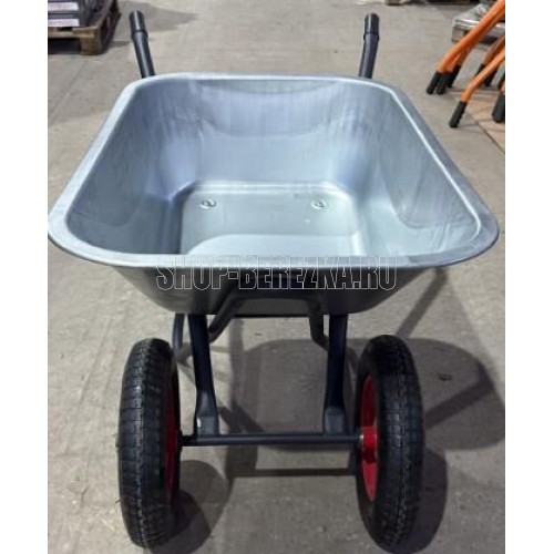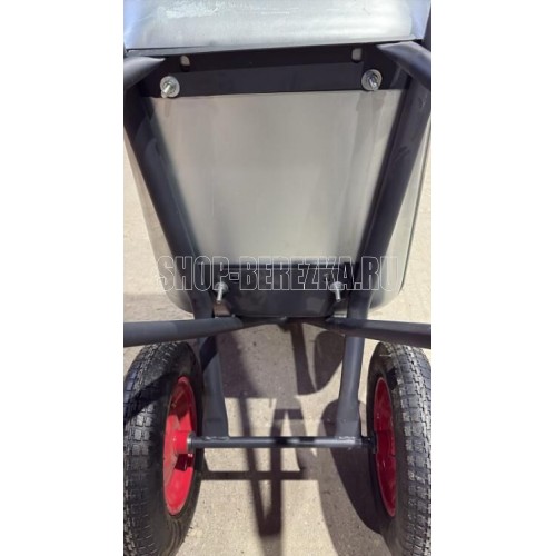 "Материал рамы: сталь Диаметр рамы: O32х1.2мм Материал подрамника: сталь Диаметр подрамника: O25х1.2мм Материал кузова: оцинкованная сталь, S - 0,7 мм Объем кузова: 110 л., квадратное Количество колес: 2 шт. Размер колеса: O3.20"" Диаметр втулки колеса: 20мм". Грузоподъемность: 260кг.