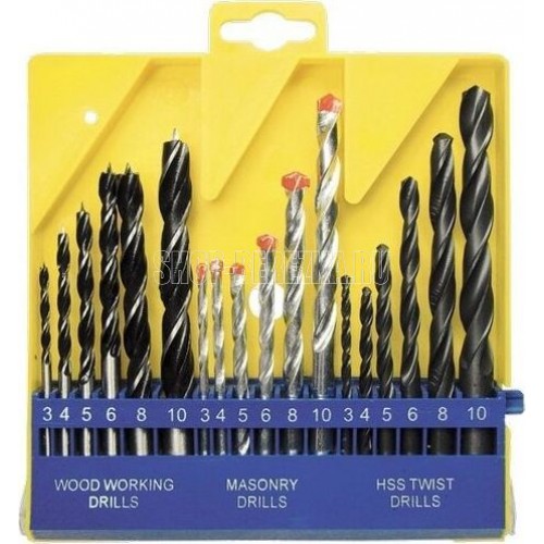 Количество предметов 18. Материал обработки дерево, металл, бетон. Материал сверл по бетону 40Х, ВК6. Материал сверл по дереву углеродистая сталь. Материал сверл по металлу HSS. Размер сверл по бетону, мм 3 х 60, 4 х 73, 5 х 85, 6 х 97, 8 х 118, 10 х 118. Размер сверл по дереву, мм 3 х 60, 4 х 75, 5 х 85, 6 х 91, 8 х 114, 10 х 120. Размер сверл по металлу, мм 3 х 60, 4 х 75, 5 х 85, 6 х 91, 8 х 115, 10 х 13.1 Страна производства Китай. Тип хвостовика цилиндрический.