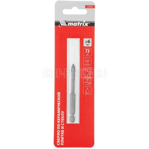 Сверло Matrix 72836 диаметром 6 мм, с шестигранным хвостовиком, используется для сверления керамической плитки, стекла и других материалов с помощью дрели или шуруповерта. Выдерживает высокие нагрузки и подходит для интенсивного использования.