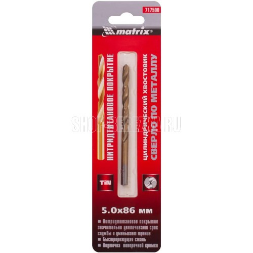 Сверло Matrix 717500 диаметром 5 мм, из стали HSS, с нитридтитановым покрытием и цилиндрическим хвостовиком, предназначено для получения отверстий в металле. Угол заточки 118° оптимален для работы с черными металлами, сталью, чугуном и твердой бронзой.