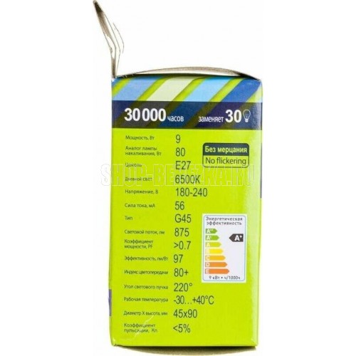 LED лампа, Мощность 9 Вт, Эквивалент лампы накаливания 80 Вт, Цоколь E27, Цветовая температура 6500 К, Световой поток 800 лм, Угол светового пучка 220, Индекс цветопередачи 80+