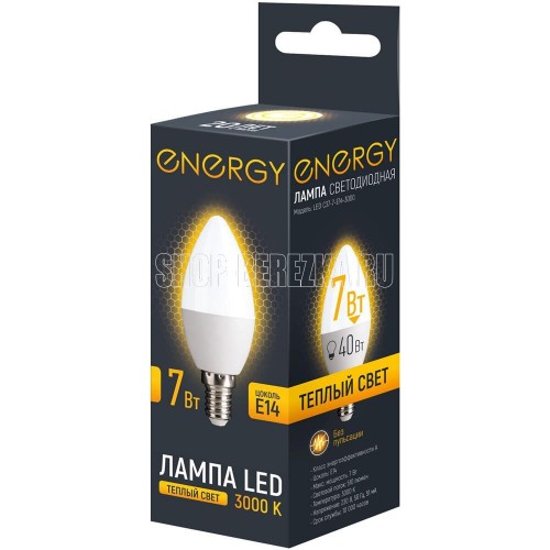 Лампа светодиодная Energy LED С37-7-E14-3000 Цоколь E14 Световой поток 510 люмен Срок службы 10 000 часов Цветовая температура 3000 К (теплый свет) Класс энергоэффективности А Без пульсации Напряжение 230 В, 50 Гц Диаметр 3,8 см Высота 10 см Мощность аналога лампы накаливания 40 Вт Мощность 7 Вт