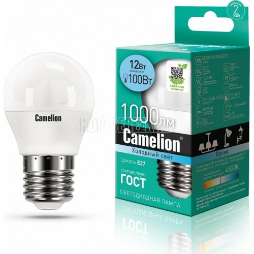 LED лампа, мощность, Вт - 12, напряжение, В - 170-265, световой поток, лм - 1000, форма колбы - шар, цвет колбы - белый, цоколь E27, цветовая температура, К - 4500, угол светового пучка - 220, индекс цветопередачи 80+, срок службы, ч. - 30000