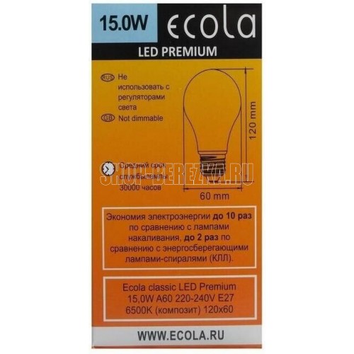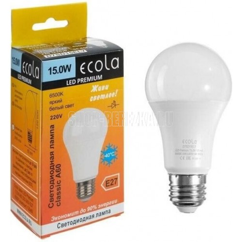 ECOLA classic LED Premium 15,0W A60 220-240V E27 6500K (композит) 120x60 Цоколь Е27 Форма груша Мощность 15,0W Цветовая температура 6500K Напряжение 220-240В Размер 120x60 мм