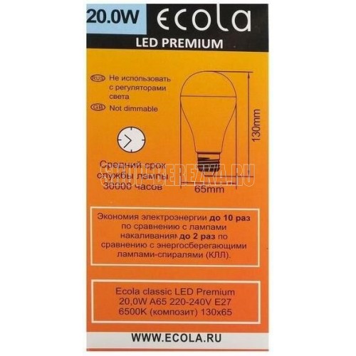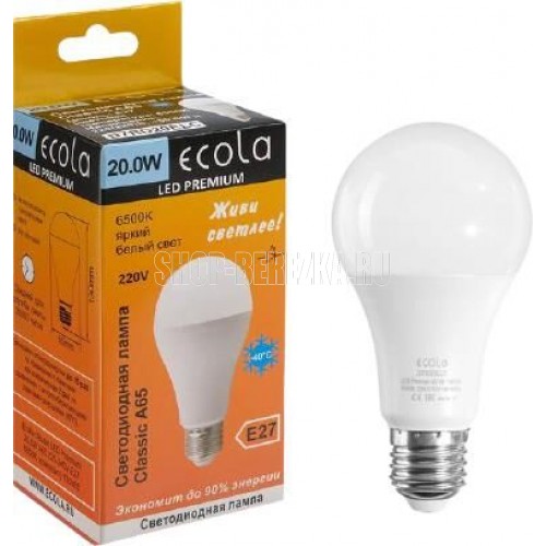 ECOLA classic LED Premium 20,0W A65 220-240V E27 6500K (композит) 130x65 Цоколь Е27 Форма груша Мощность 20,0W Цветовая температура 6500K Напряжение 220-240В Размер 130x65 мм