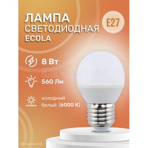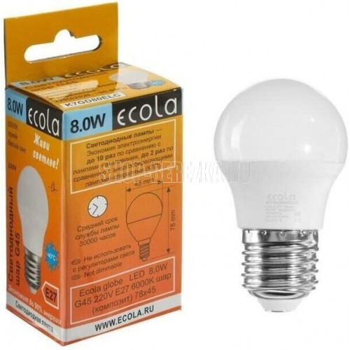 ECOLA globe LED 8,0W G45 220V E27 6000K шар (композит) 78x45 Цоколь Е27 Форма шар Мощность 8,0W Цветовая температура 6000K Напряжение 220В Размер 78x45 мм