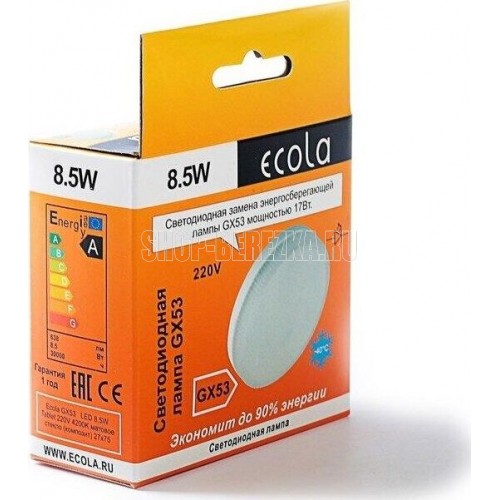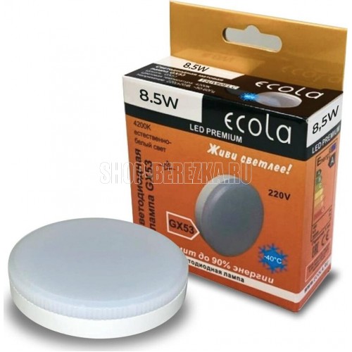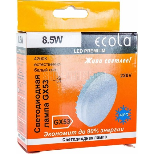 ECOLA GX53 LED Premium 8,5W Tablet 220V 4200K матовое стекло (композит) 27x75 Цоколь GX53 Мощность 8,5W Цветовая температура 4200K Напряжение 220В Средний срок службы 30000 часов Размер 27x75 мм