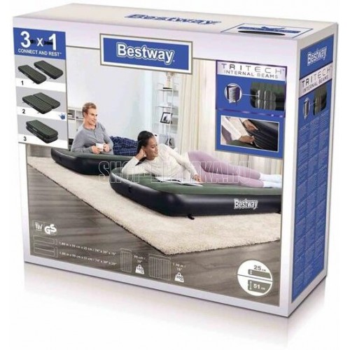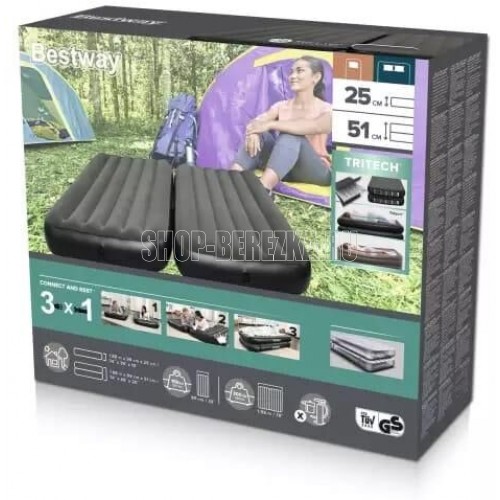 Матрас 3 в 1, можно использовать как: 1. Односпальный матрас высотой 51 см, положив две половинки друг на друга и закрепив фиксаторами. 2. Два отдельных односпальных места высотой 25 см. 3. Двуспальный матрас, соединив две половинки фиксаторами