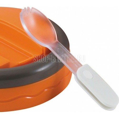 Емкость 0,5 л. Материал: пластмасса - Двойные вакуумные пластиковые стенки, пространство между стенками заполнено теплоизоляционной пеной. - Внутри пластиковая емкость, разделенная на 2 отделения, благодаря чему термос можно использовать для нескольких блюд одновременно. - Не подходит для первых блюд. - В комплект также входит ложка, вложенная в отделение на крышке термоса. - Ширина горла 14,5 см Упаковка: вкладыш + термоусадка