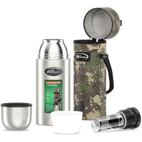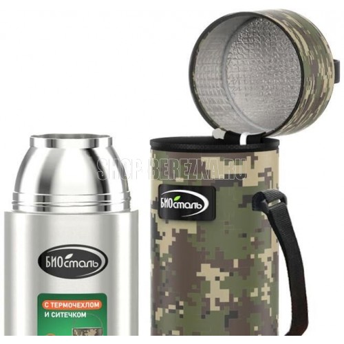 Термос из нержавеющей стали 18/8 (AISI 304) с ситечком для заваривания и пробкой-контейнером. Пробка с дополнительной изоляцией и функцией «термоконтроль» позволяет наливать напитки без полного откручивания пробки под любым углом. Ситечко из высококачественной нержавеющей стали 18/8. Дополнительная чашка из прочного пищевого пластика. Термочехол из прочной камуфляжной ткани защищает термос от повреждений и повышает его термозащиту.