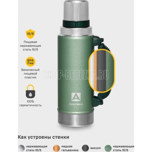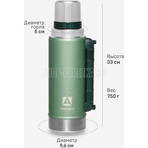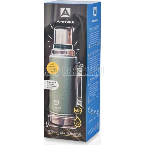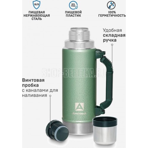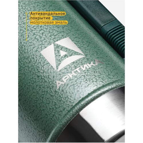 АРКТИКА 1.25 л, 106-1250P (зеленый) ип Термос Описание Термос вакуумный с глухой пробкой и ручкой 1250 мл. Покрытие из молотковой эмали дополнительно защищает термос от сколов и царапин. Объем 1.25 л Время удержания тепла 40 ч Тип теплоизоляции вакуум Тип пробки винтовая Тип горловины узкая Чехол в комплекте отсутствует Крышка-чашка есть Количество крышек-чашек 1 шт Цвет зеленый Материал корпуса нержавеющая сталь Материал колбы нержавеющая сталь Материал ручки пластик Размеры 96.2 х 330 х 96.2 мм Вес 890 грамм Тип упаковки картонная коробка
