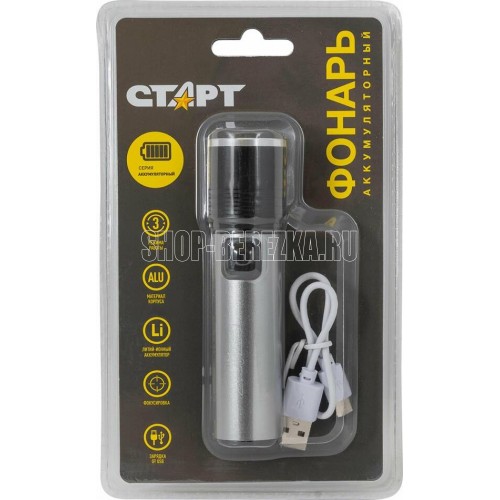 Фонарь. Источник света: LED, 5 Вт Тип аккумулятора: Li-Ion, 3,7 В, 1200 мАч Световой поток, Лм: 300 Время зарядки: от 3 ч Время работы: от 4 ч Материал корпуса: алюминий Габариты, мм: 112 х 27 х 25 Масса нетто, г: 120 Цвет корпуса: серебряный 3 режима работы Зарядка от USB Фокусировка