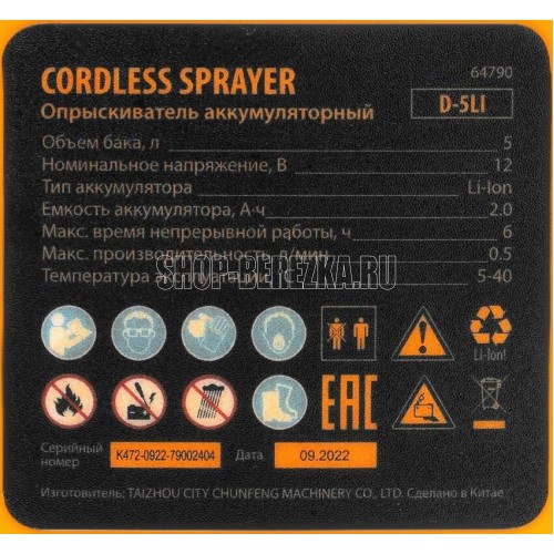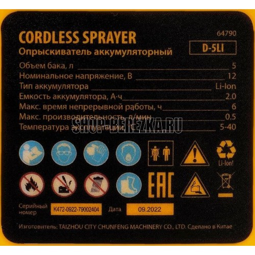 DENZEL Опрыскиватель аккумуляторный D-5LI, 5 л, 12 В, 2 Ач 64790