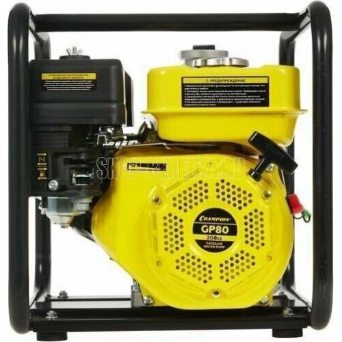 Мотопомпа оснащена четырехтактным двигателем объемом 208см3, который позволяет перекачивать 10000 литров воды в минуту. Мотопомпа оснащена обратным клапаном, который предотвращает всасывание воды из корпуса насоса. Это способствует достаточному количеству воды в корпусе насоса для следующего запуска помпы. Технические характеристики Champion GP80 Высота подъема, м 28 Объем двигателя, см3- 208 Производительность, л/мин 1000 Габариты, мм 517x415x452 Тип для чистой воды Стартер ручной Мощность (Вт), Вт 4500 Модель двигателя UP168 OHV Производитель двигателя Champion Диаметр выходного отверстия (мм) 80 Тип двигателя бензиновый Вес, кг 30 Диаметр входного отверстия, мм 80 Емкость топливного бака, л 3.6 Двигатель Champion UP168 OHV Высота всасывания, м 8 Тактность двигателя 4-х тактный Вид пожарная мотопомпа Мощность (л.с.), л.с. 6,5