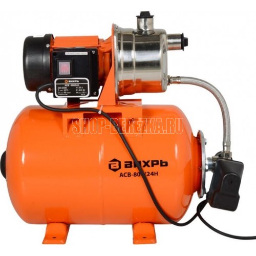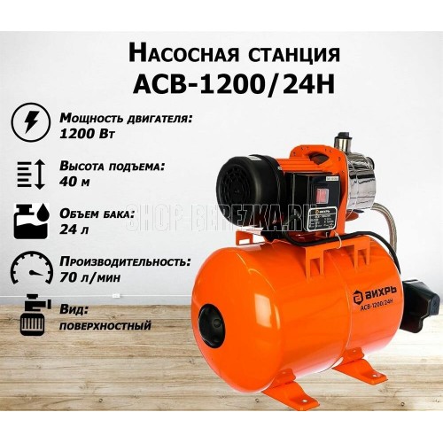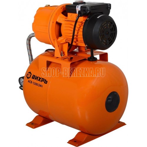Насосная станция ВИХРЬ АСВ-1200/24Ч. Мощность, Вт – 1200; Емкость гидроаккумулятора, л – 24; Максимальный напор, м - 45; Максимальная подача, л/мин – 70; Материал корпуса насоса – чугун;